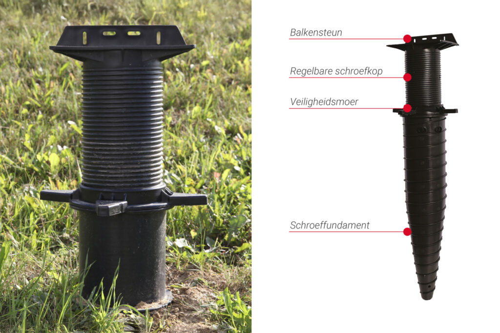 De Hapax Rock werkt met een innovatief schroefmechanisme dat zich stevig verankert in de vaste grondlaag. Het systeem is direct belastbaar met een draagkracht tot 450-800kg per punt (afhankelijk van de bodem). Voor een optimale installatie in harde grond adviseert de fabrikant een voorgat van Ø 40mm. Met de bijbehorende indraaihulp installeer je de fundamenten met uiterste precisie.